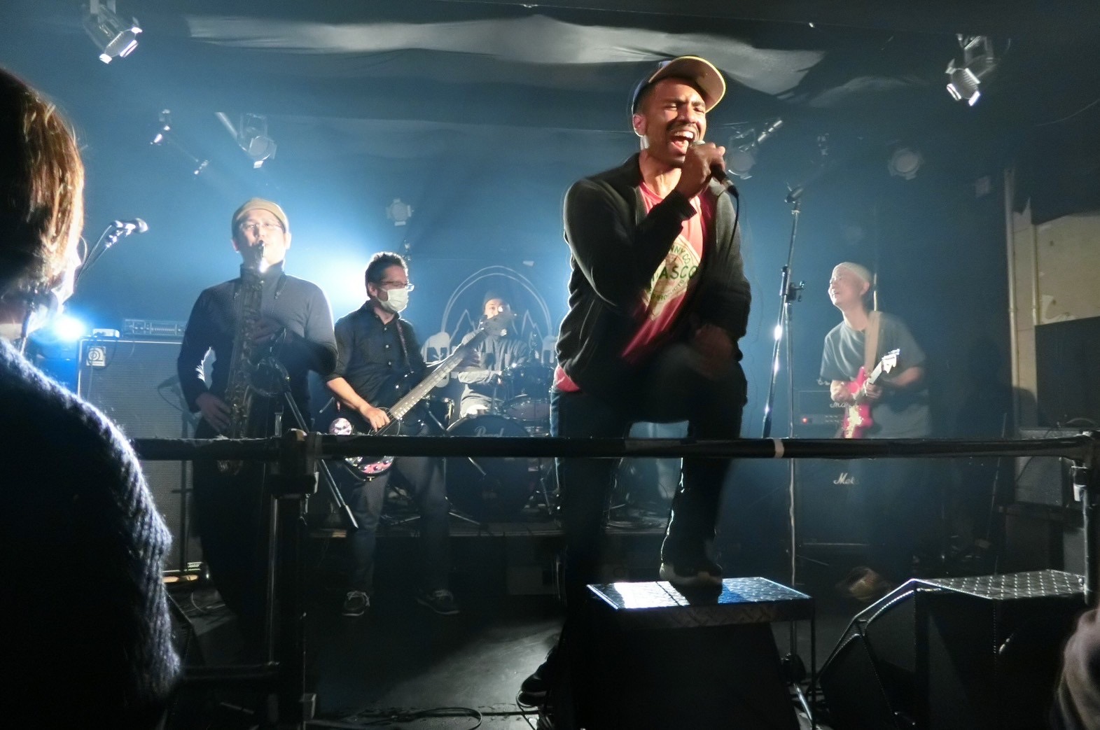 ドラム、ベース、ギター、サックス、キーボード、ボーカル、マイク3本