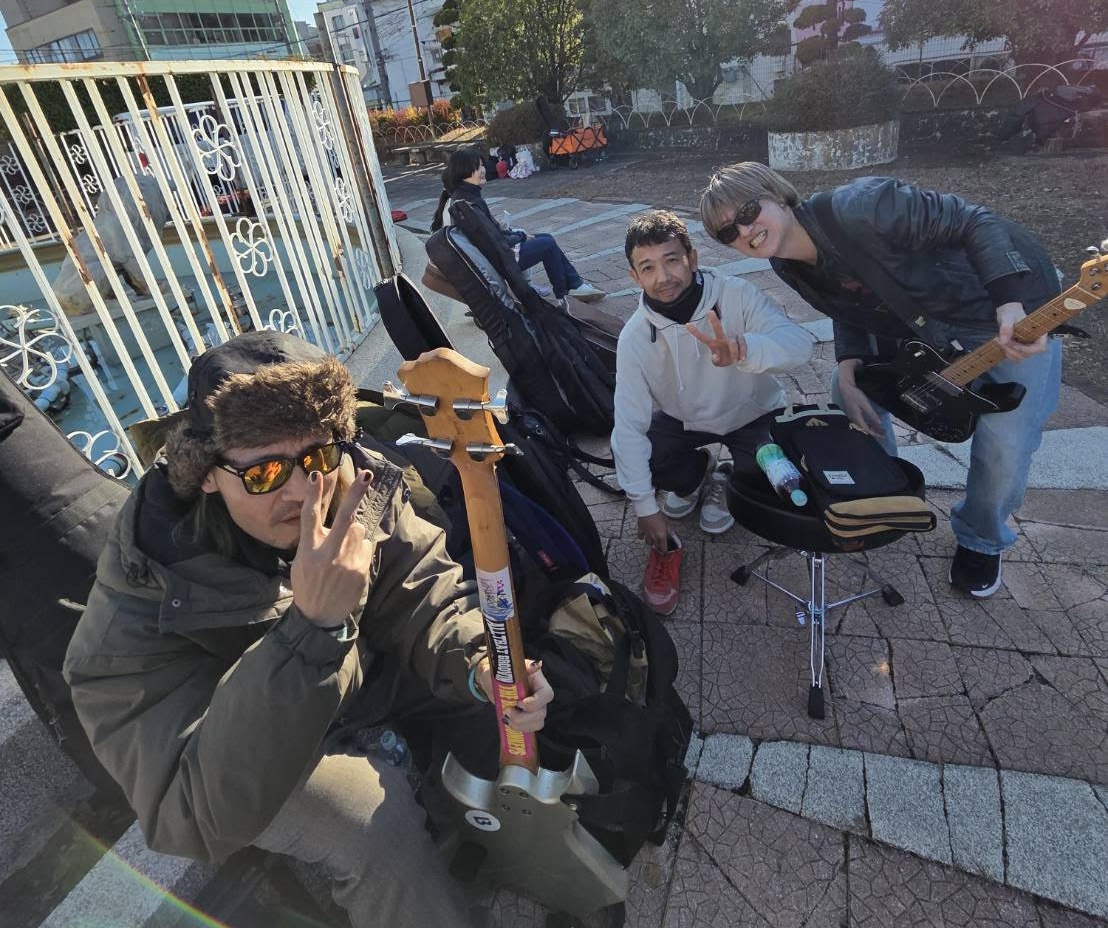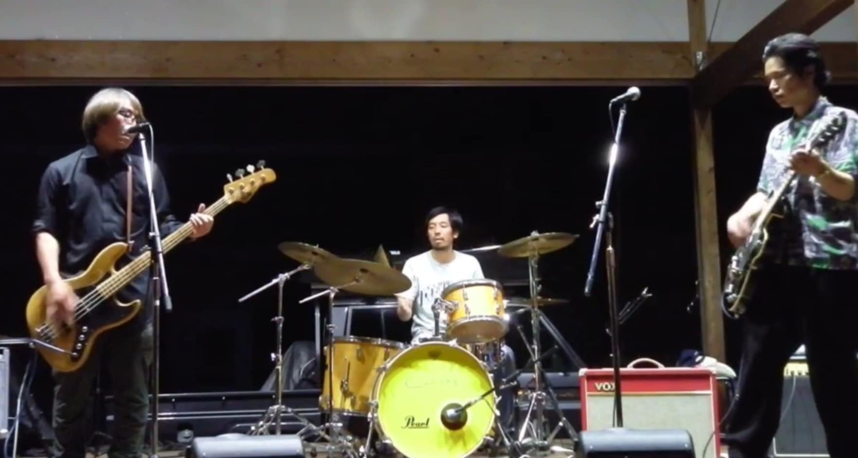 エレキギター、エレキベース、ドラム、マイク3本